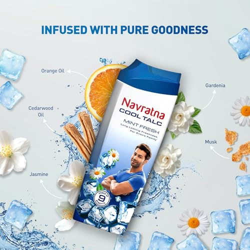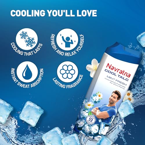 Stay cool and refreshed all day with Navratna Cool Talc Powder with Mint Fresh Cooling. Specially formulated to provide immediate relieve from heat and sweat, this refreshing body powder is perfect for hot and humid days when you need comfort and freshness. Infused with mint extract, Navratna Cool Talc Powder offers an instant cooling that soothes your skin, making it feel invigorated and refreshed. It absorbs excess sweat and moisture, keeping your skin dry and preventing discomfort caused by sweat and odor. The sweat-absorbing formula ensures long-lasting freshness, so you can stay confident no matter the weather or activity level. The subtle, all-day fragrance of this talcum powder leaves your skin smelling fresh without being overpowering. Whether you’re heading out for a workout, spending time outdoors, or just looking for relief from the heat, Navratna Cool Talc Powder keeps you feeling fresh and comfortable throughout the day.