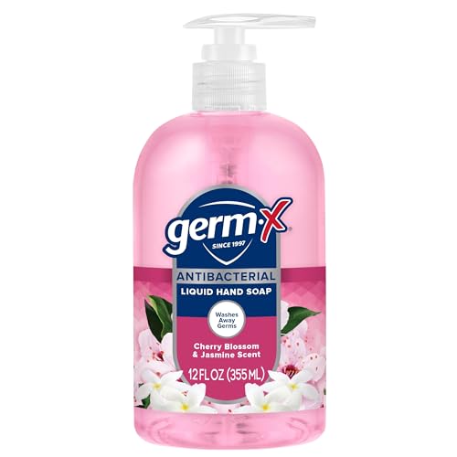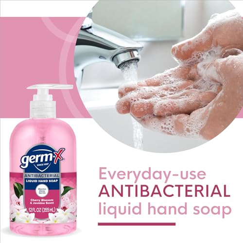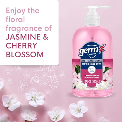 Germ-X Antibacterial Hand Soap, 12 Oz (Pack 4), Moisturizing Liquid Hand Wash for Kitchen or Bathroom, pH Balanced & Dermatologist Tested, Jasmine & Cherry Blossom Scent, Pump Bottle