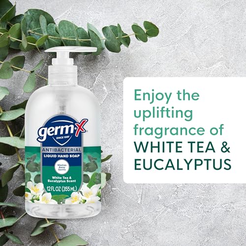 Germ-X Antibacterial Hand Soap, 12 Oz (Pack 4), Moisturizing Liquid Hand Wash for Kitchen or Bathroom, pH Balanced & Dermatologist Tested, White Tea & Eucalyptus Scent, Pump Bottle