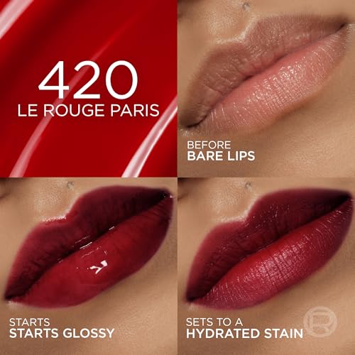 L’Oreal Paris Hyaluron Tint Lip Stain Serum, Long Lasting, Hydrating Lip Makeup Infused with Hyaluronic Acid, 420 Le Rouge Paris (Universal Red)