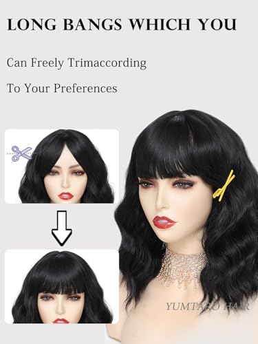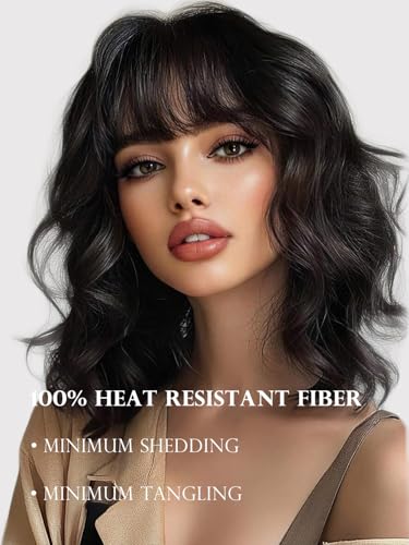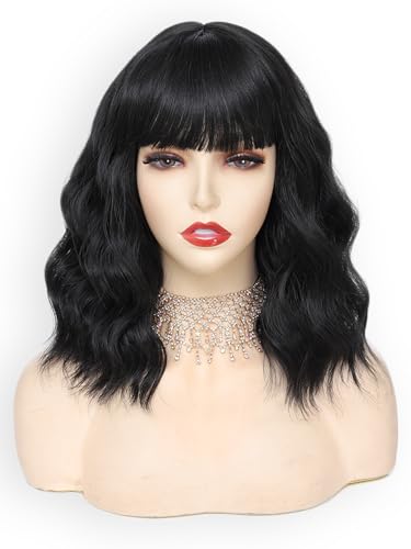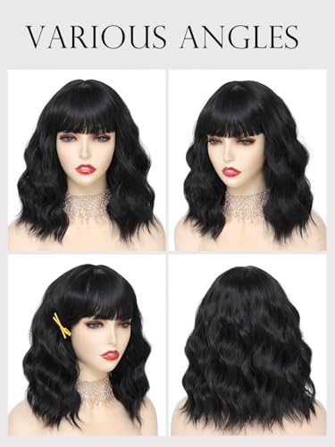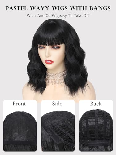 Pastel Black Wavy Bob Wig for Women, Short Shoulder Length Synthetic Wig with Bangs, Natural Looking Lightweight Hairpiece for Daily Wear & Cosplay Costume Party