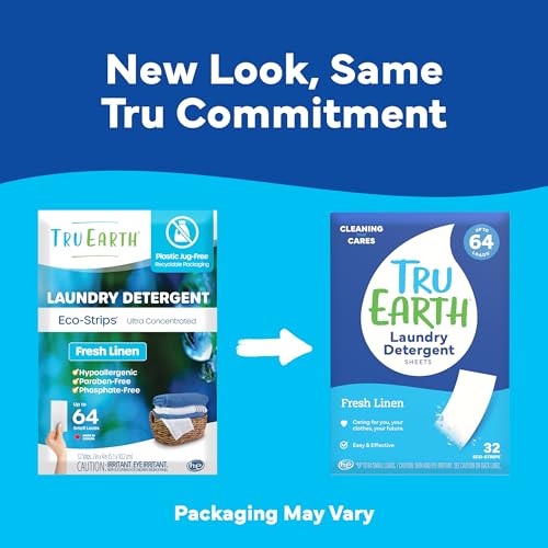Tru Earth Compact Dry Laundry Detergent – Up to 128 Loads (64 Sheets) – Paraben-Free – Original Eco-Strip Liquidless Detergent, Travel – Fresh Linen | Packaging May Vary