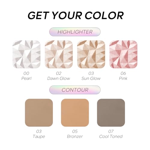 Net Weight: About 0.39 Oz/11G Colors: #01-Pearl, #02- DAWN GLOW, #03-SUN GLOW, #04-PINK, #05-TAUPE, #06-Bronzer, #07-COOL TONED, subject to actual color.