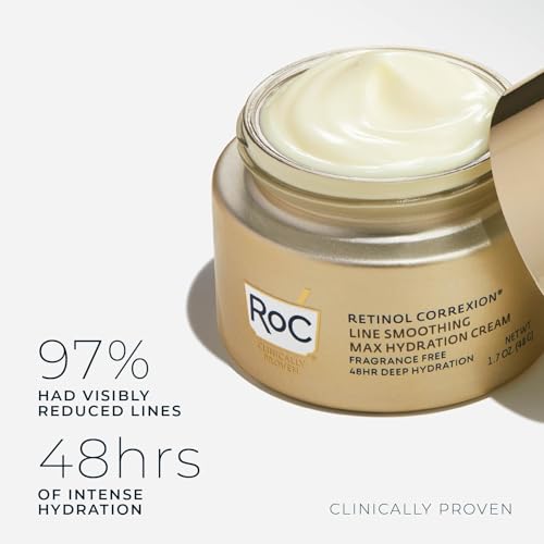RETINOL CORREXION® Line Smoothing Max Hydration Cream Fragrance Free is a fast-absorbing, fragrance-free retinol face moisturizer made for dry skin and sensitive-skin preferences. This daily cream combines RoC Clinical Retinol (America’s #1 Most Awarded Retinol*) with Hyaluronic Acid plus glycerin to deliver long-lasting hydration while helping smooth the look of fine lines and wrinkles over time. Hyaluronic Acid helps draw and hold moisture to visibly plump the look of lines, and the lightweight feel layers well under makeup. Clinical Retinol supports firmer-looking skin with continued use. In consumer testing, skin felt deeply hydrated for 48 hours; 97% saw smoother-looking skin**. In 1 week, 97% had visibly reduced fine lines and wrinkles, and after 4 weeks, 91% reported firmer-looking skin**. Formulated without fragrance and parabens, this moisturizer is dermatologist-tested, non-comedogenic (won’t clog pores), and PETA-approved cruelty free. Because retinol is a powerful active, some users may notice dryness, tightness, mild flaking, or redness when starting. For best comfort, begin every other night, apply to clean, dry skin, and follow with a gentle moisturizer if needed. Introduce one retinol product at a time and avoid using other strong exfoliants until your skin adjusts. Always wear broad-spectrum SPF 30+ during the day while using retinol, even if you apply this cream only at night. If you develop irritation such as redness or a dry patch, pause use for a few days until it subsides, then restart more slowly. If symptoms continue, stop use and consult a physician. With consistent AM + PM use, one 1.7 oz jar is designed to last about 2–3 months. *Based on a 3rd‑party study of publicly available beauty-award data (Jan 2015–Feb 2025). **clinical study with self-assessment