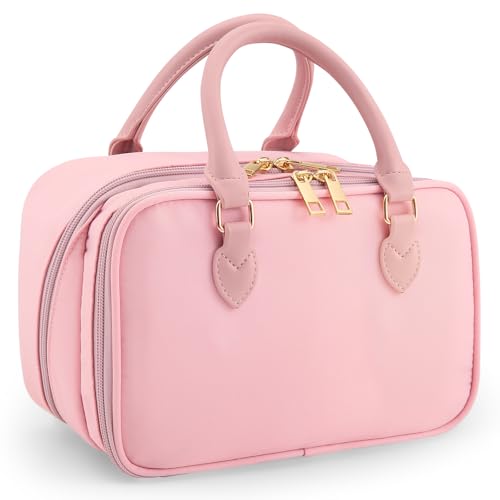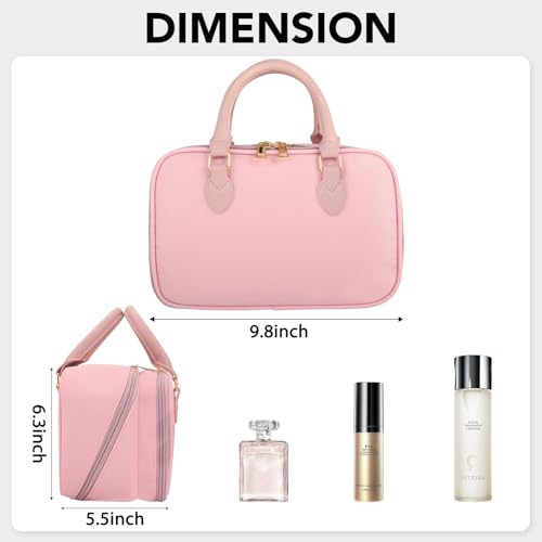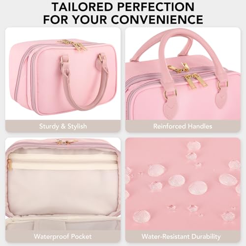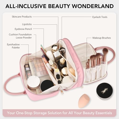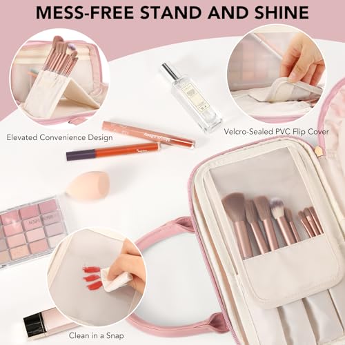 Travel Makeup Bag for Women Fashion Large Capacity Pouch Open Flat Cosmetic Portable Organizer Waterproof Large Opening Storage Toiletry Bags Vertical Free-Standing Brush Holder for Easy Access Pink
