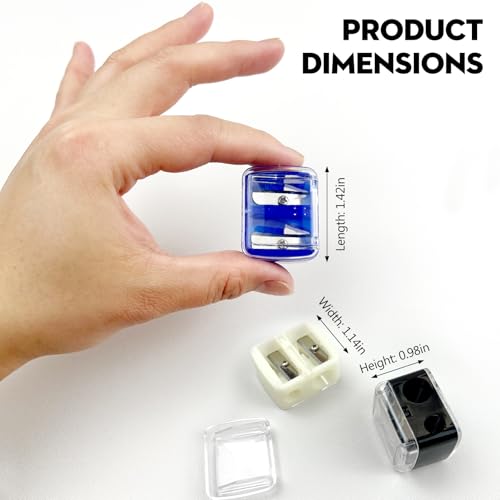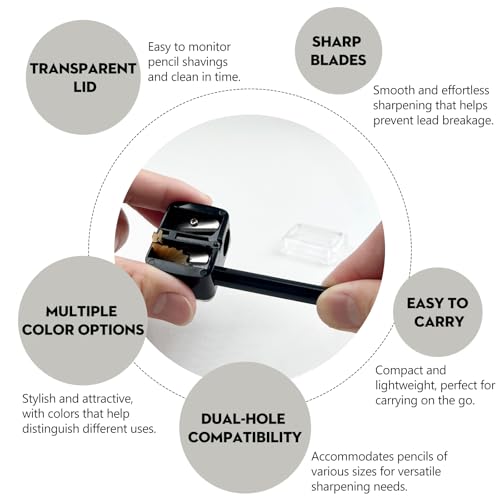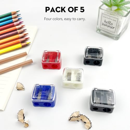 This set includes 5 sharpeners in different colors: 2 black, 1 red, 1 white, and 1 blue. Each sharpener features a removable transparent cover for easy cleaning and to keep the sharpened pencil shavings contained, making it a practical choice for daily use.